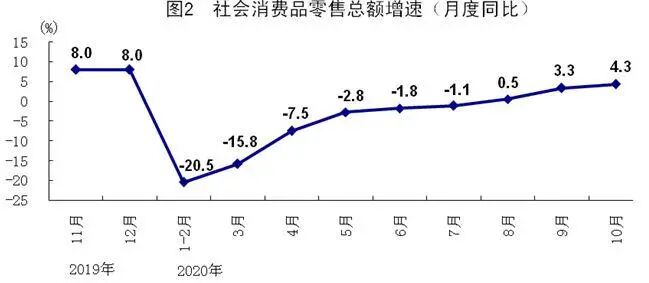 根据第四次全国经济普查结果对2019年社会消费品零售总额进行了修订,2020年月度增速按照可比口径计算。