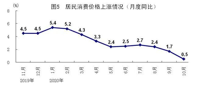 10月份,全国居民消费价格同比上涨0.5%,涨幅比9月份回落1.2个百分点;环比下降0.3%。1-10月份,全国居民消费价格同比上涨3.0%,涨幅比1-9月份回落0.3个百分点。分类别看,10月份,食品烟酒价格同比上涨2.4%,衣着下降0.3%,居住下降0.7%,生活用品及服务下降0.1%,交通和通信下降3.9%,教育文化和娱乐上涨1.1%,医疗保健上涨1.5%,其他用品和服务上涨2.4%。在食品烟酒价格中,猪肉下降2.8%,鲜菜上涨16.7%,粮食上涨1.5%,鲜果上涨0.4%。扣除食品和能源价格后的核心CPI上涨0.5%,涨幅与9月份持平。