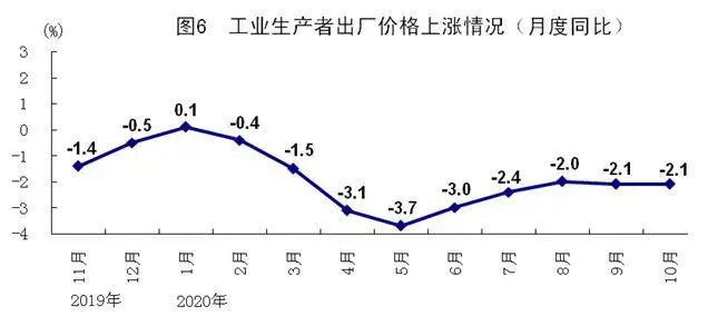10月份,全国工业生产者出厂价格同比下降2.1%,降幅与9月份持平;环比持平。工业生产者购进价格同比下降2.4%,降幅比9月份扩大0.1个百分点;环比上涨0.2%。1-10月份,全国工业生产者出厂价格和工业生产者购进价格同比分别下降2.0%、2.6%。